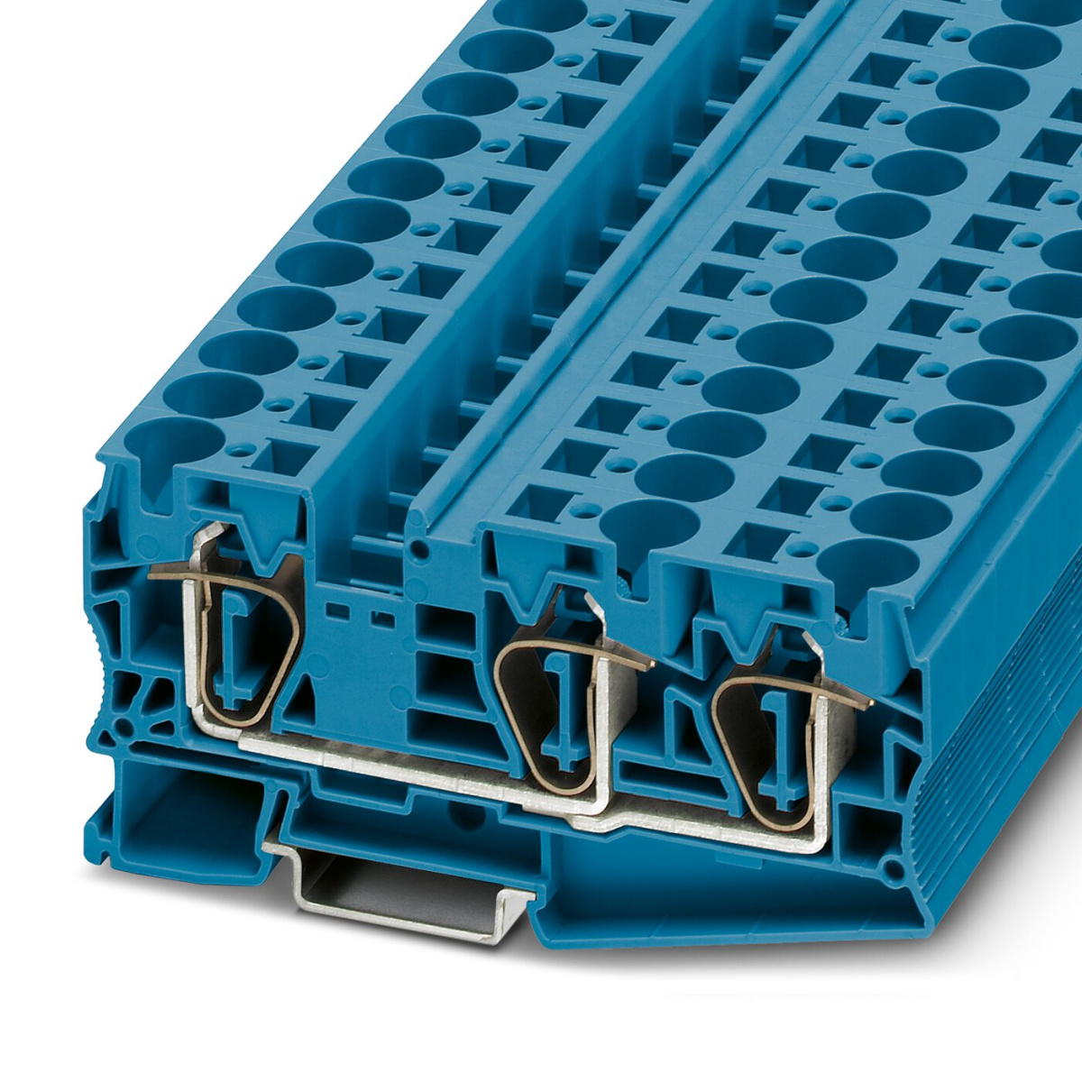 Проходные клеммы, количество точек подсоединения: 3, номинальное напряжение: 800 В, номинальный ток: 90 A, тип подключения: пружинный зажим, расчетное сечение: 16 мм², сечение: 0,5 мм² - 25 мм², тип монтажа: РМ-35/15, РМ-35/7,5, цвет: синий